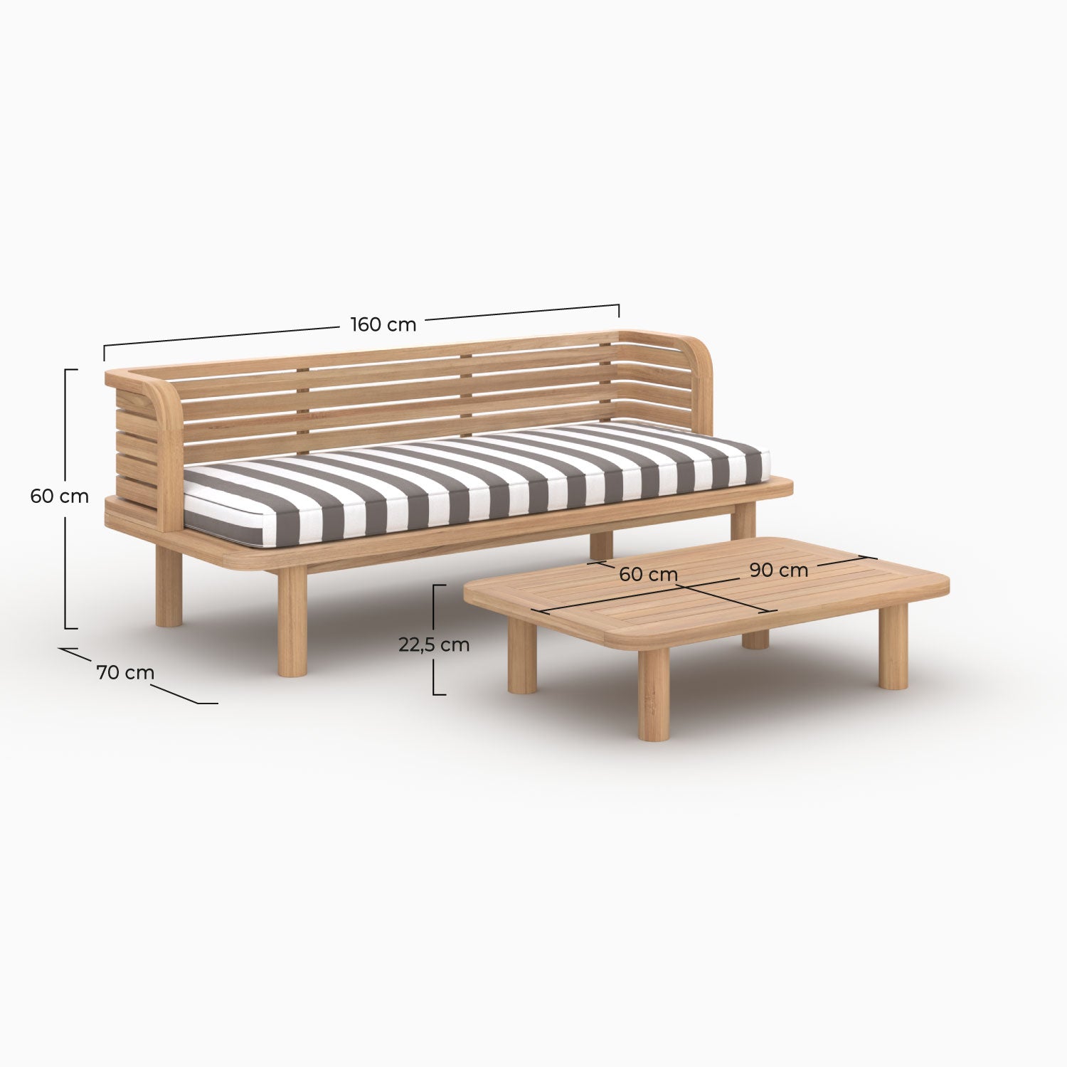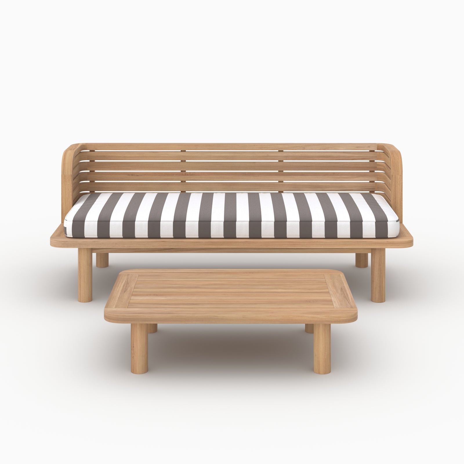 Das Kilda 2er Set besteht aus einem Sofa und einem Couchtisch aus massivem Teakholz, das wegen seiner Robustheit und natürlichen Eleganz ausgewählt wurde. Das gestreifte graue Kissen, modern und raffiniert, bringt einen trendigen grafischen Akzent und bietet gleichzeitig angenehmen Komfort. Abnehmbar ist es für eine praktische Nutzung im Freien gedacht.