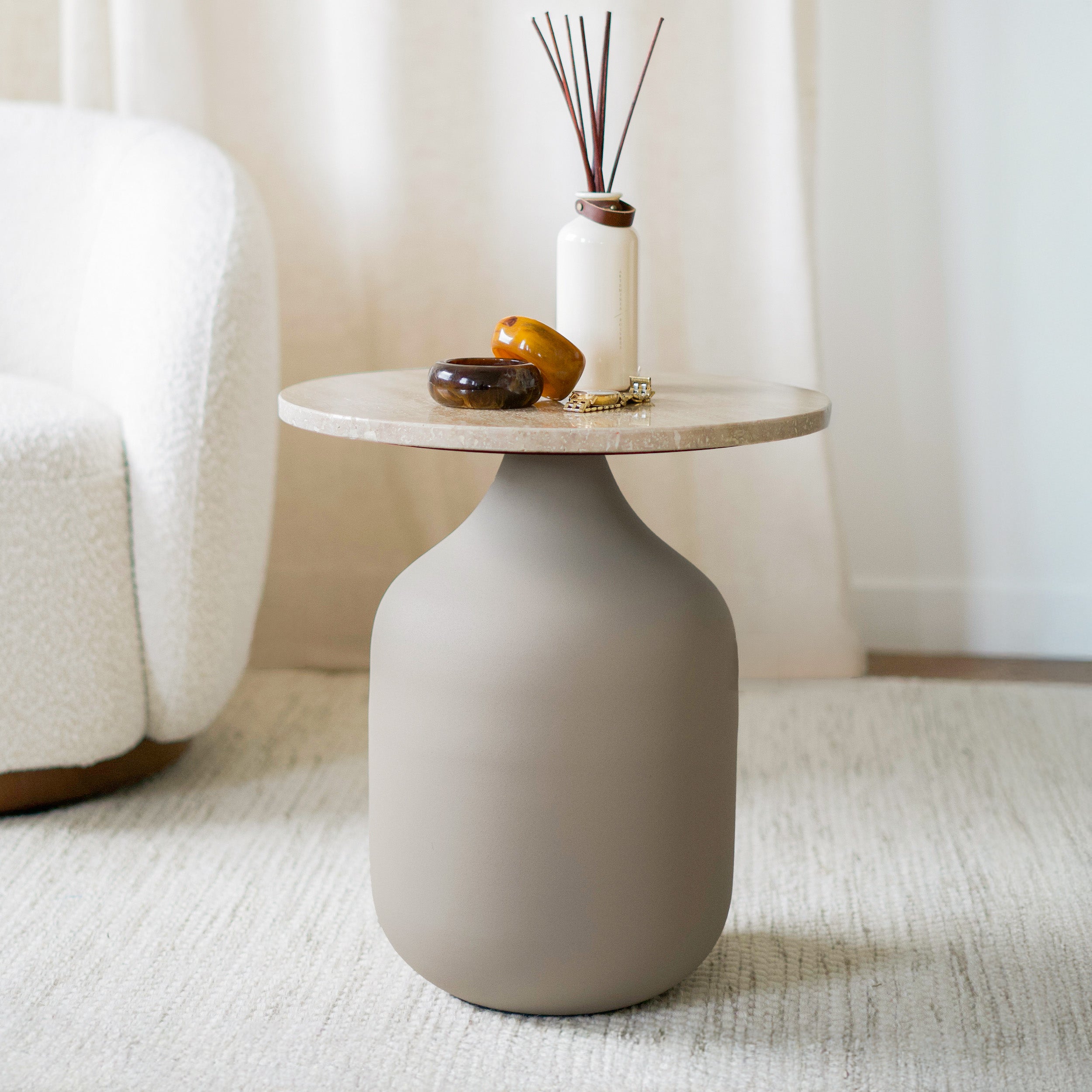 Mesa auxiliar redonda de travertino y metal beige