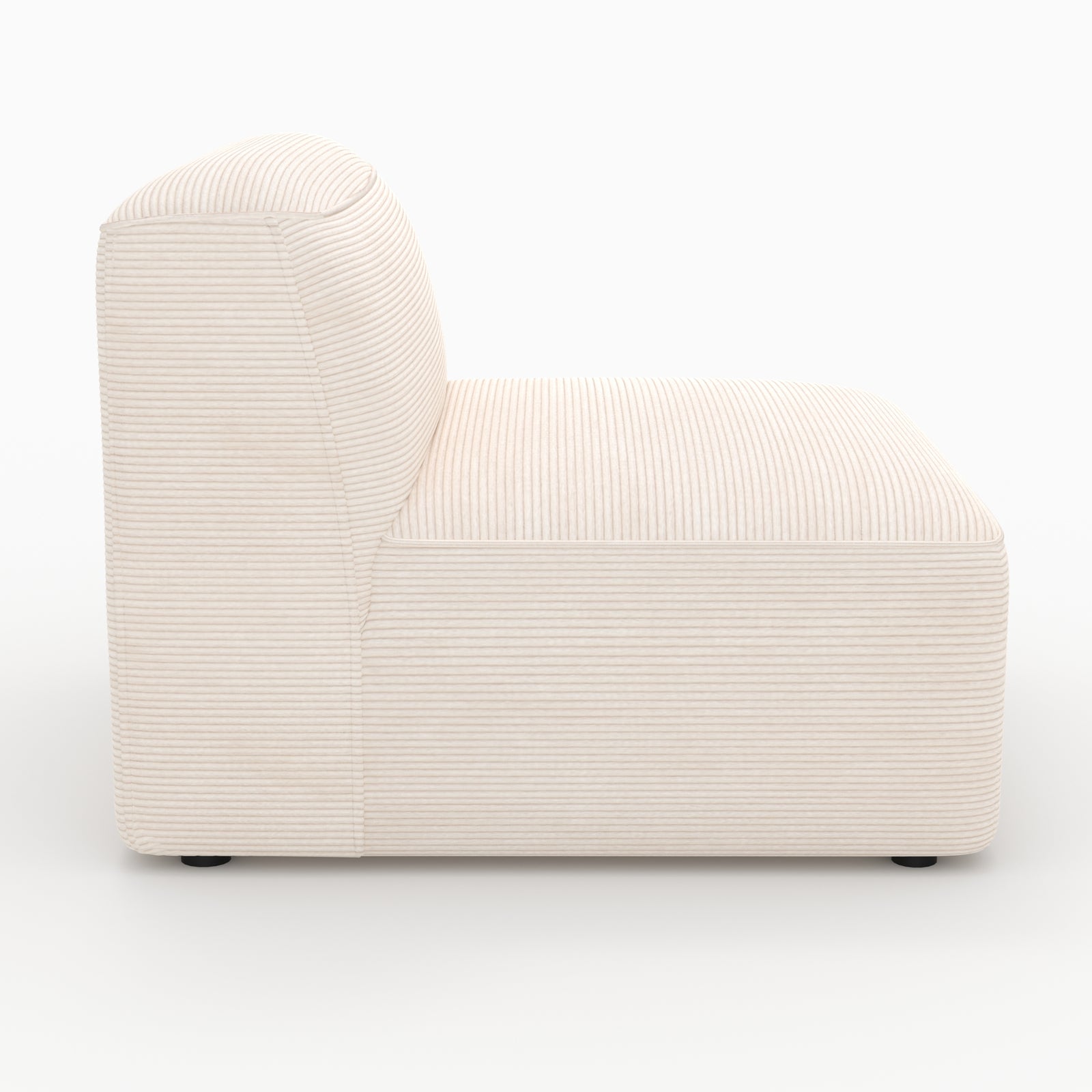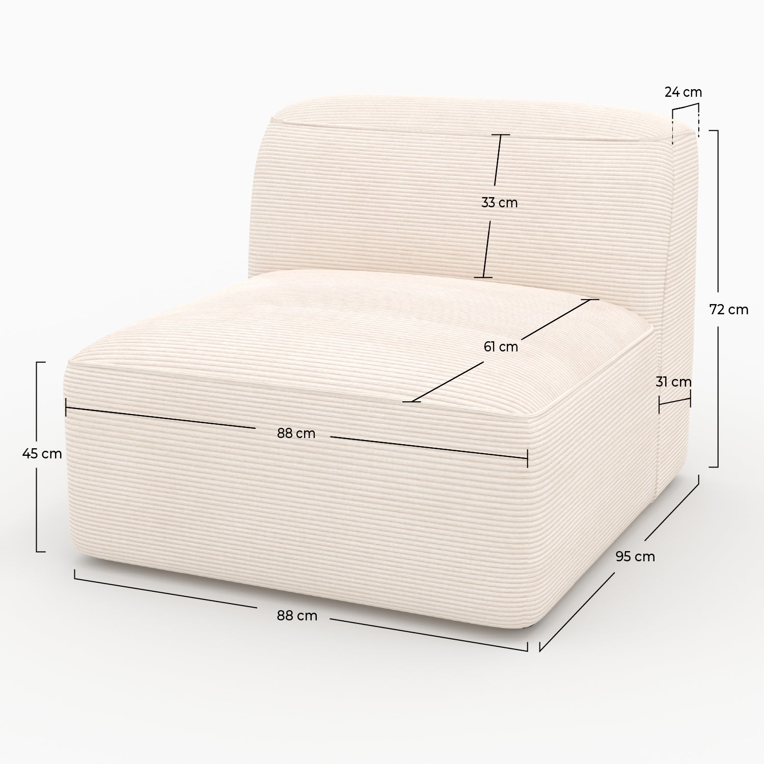 En solitario o en composición, el sillón Mina ofrece un asiento amplio, hiper cómodo, vestido con un suave terciopelo blanco roto, resistente y anti-pilling.