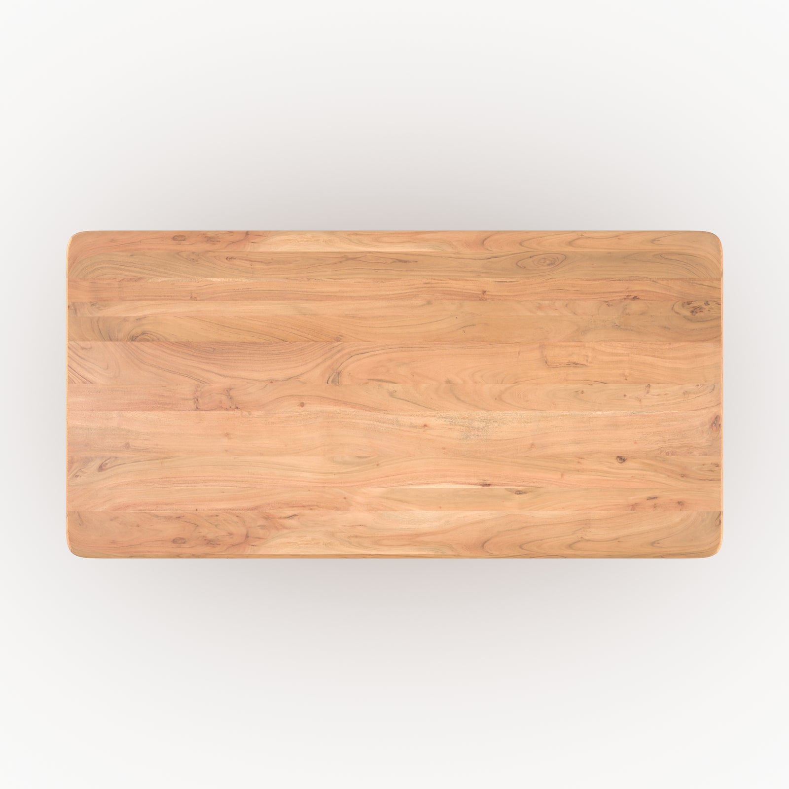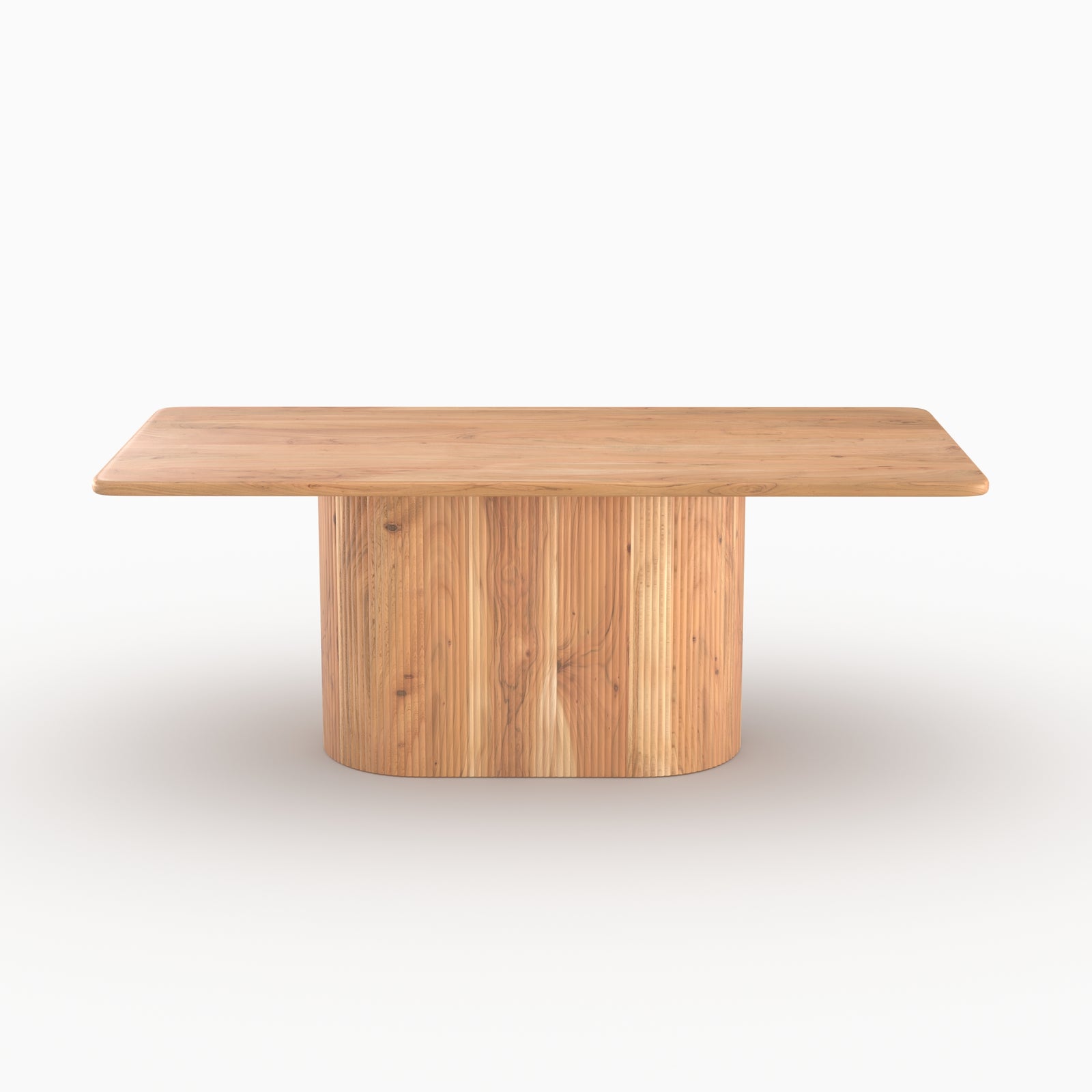 Fabricada en madera maciza de acacia, ofrece un tacto suave gracias a su acabado barnizado, ideal para un mantenimiento simplificado en el día a día. Sus líneas redondeadas, de la superficie a la base, revelan un diseño todo en suavidad y equilibrio.