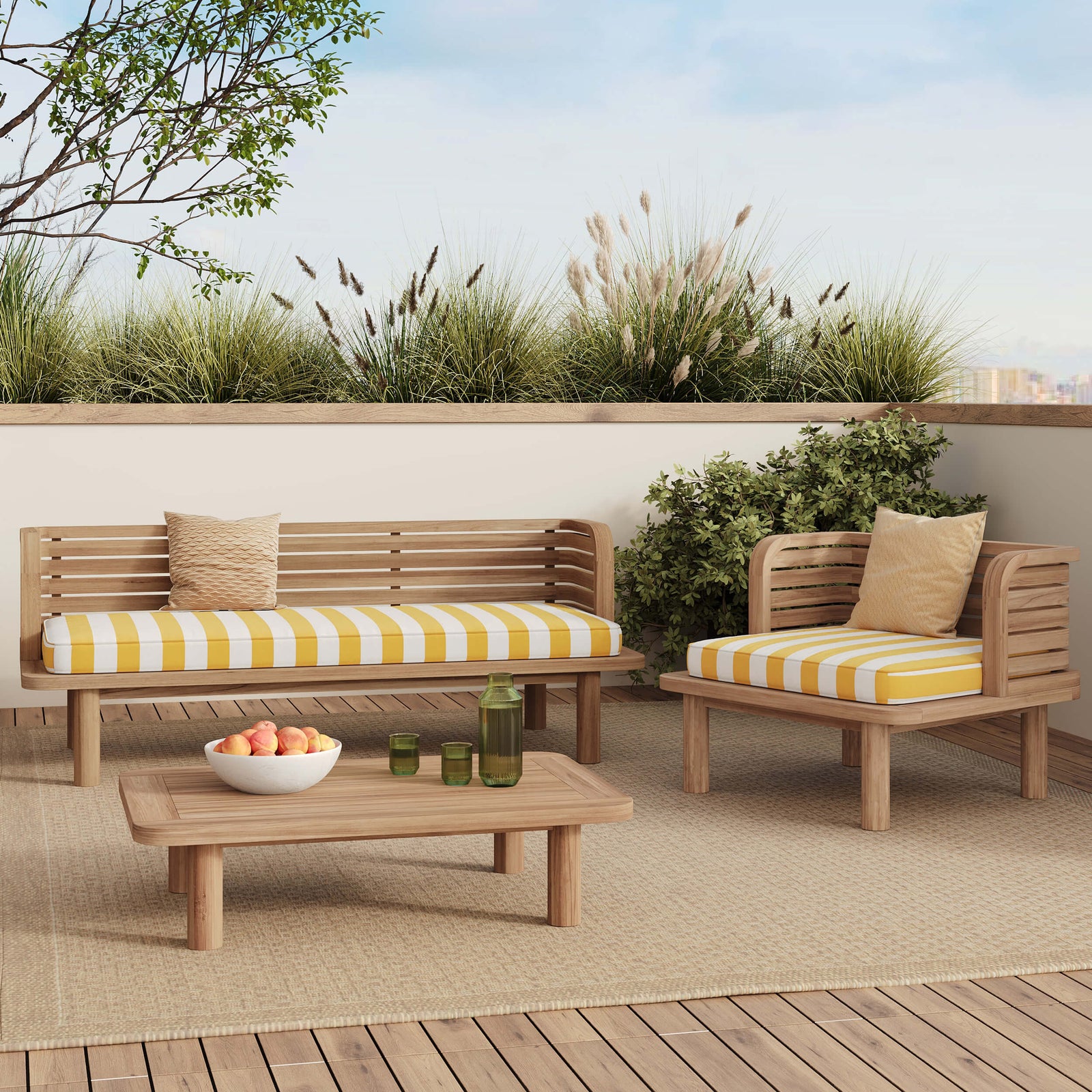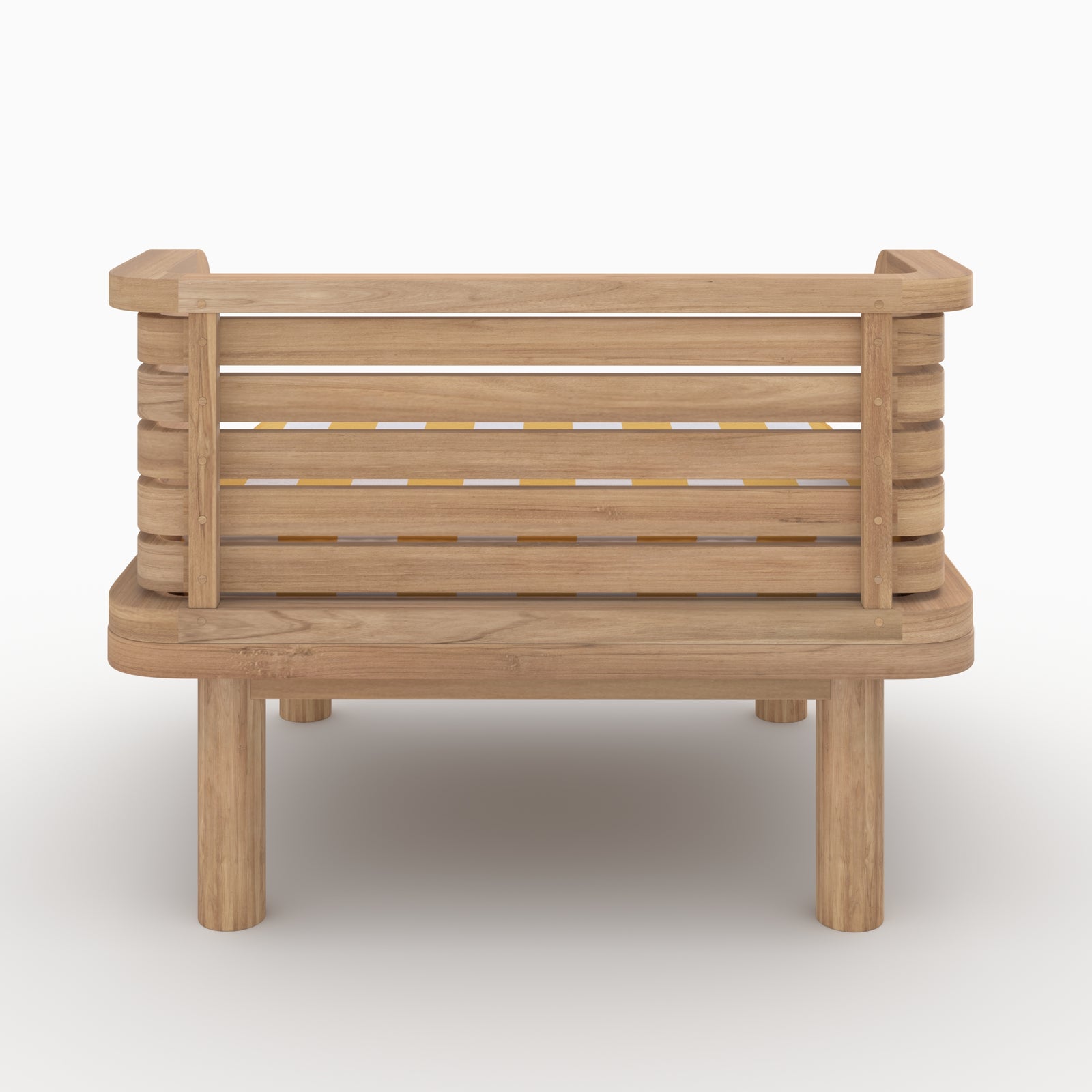 El sillón Kilda combina el encanto rústico de la teca maciza con el brillo de su cojín a rayas amarillas, para un exterior luminoso y decididamente estiloso.