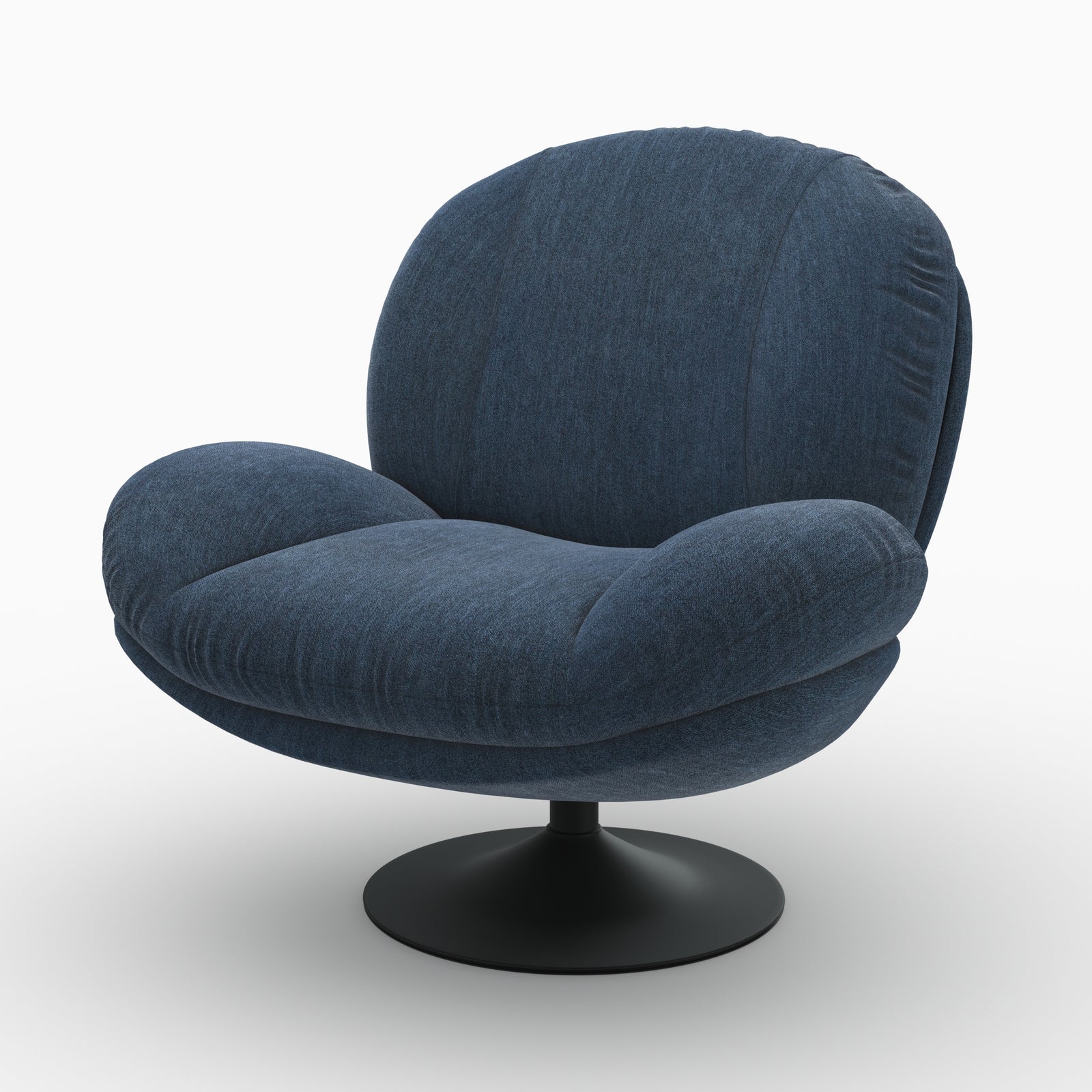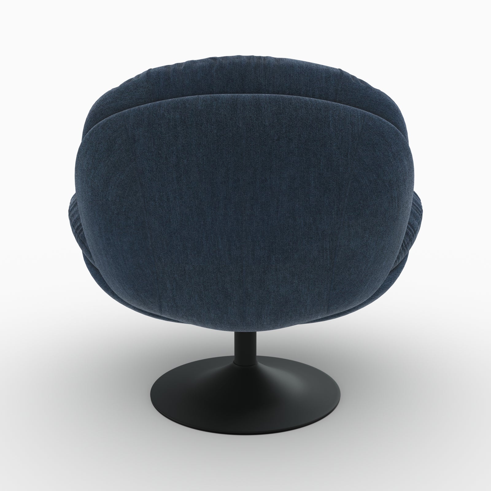 Sus líneas redondeadas y su tejido efecto terciopelo azul oscuro ofrecen un asiento envolvente y lleno de suavidad. La base giratoria, discreta y fluida, permite una rotación natural que se adapta a tus deseos.