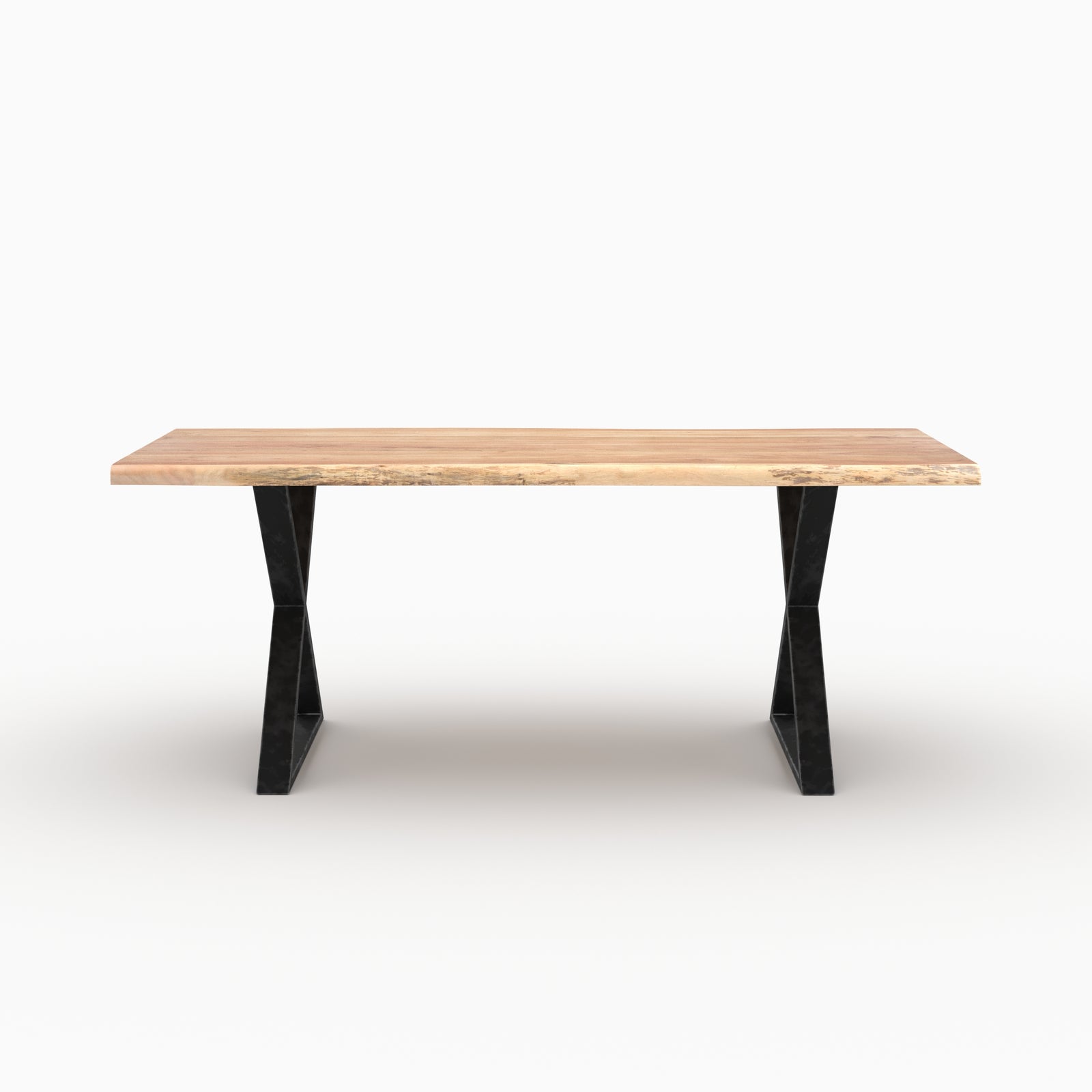 Son large plateau en acacia massif révèle tout le caractère du bois naturel. En contraste, son piètement croisé en métal noir apporte structure et modernité à l’ensemble.