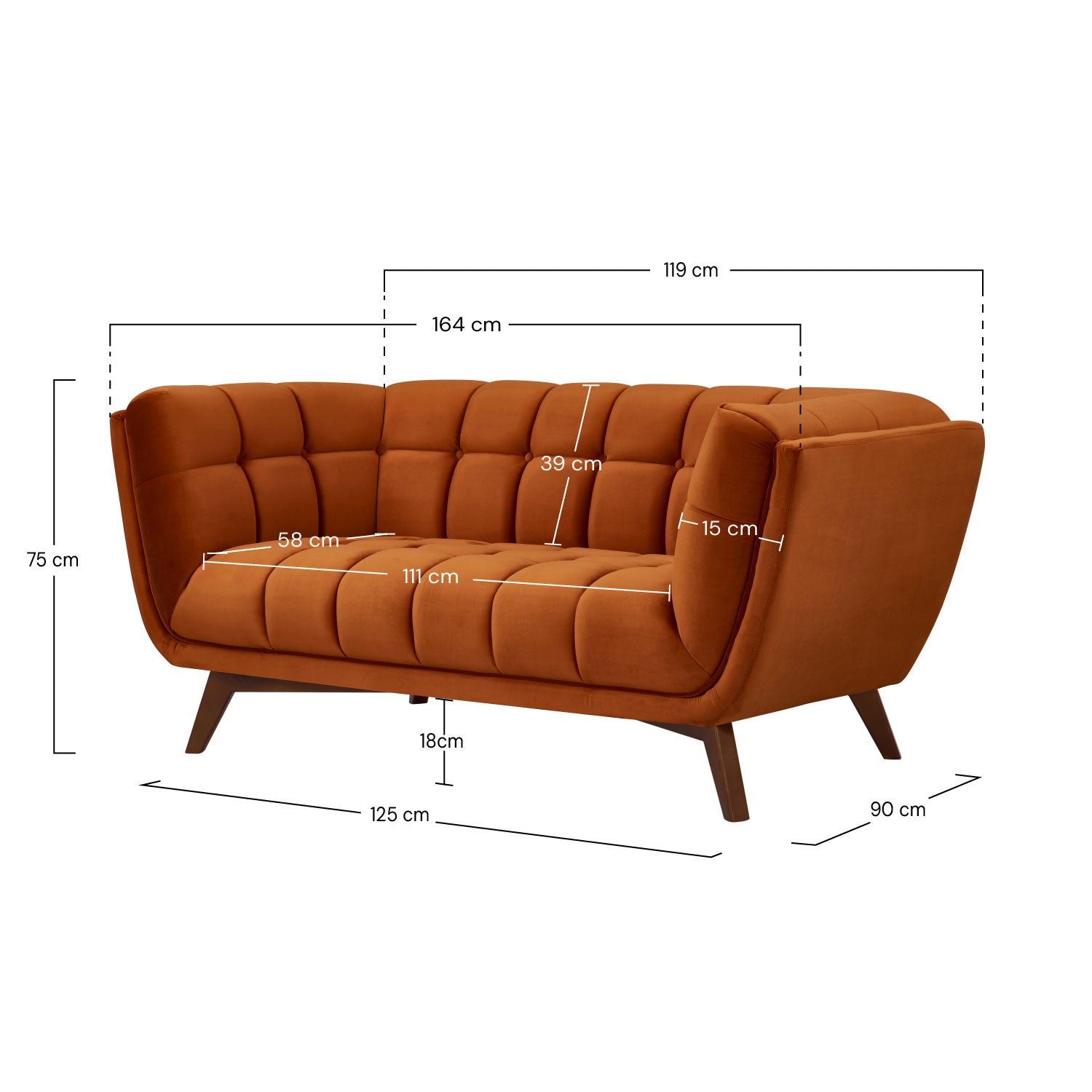 Il divano Mona a 2 posti è un divano morbido, pratico ed ergonomico che vi sorprenderà per le sue belle dimensioni L 164 x P 9. x H 76 cm. costituito da una robusta struttura in legno di eucalipto con una base in legno di rovere scuro e di tendenza. Tutto il fascino del divano a 2 posti Mona risiede nel suo rivestimento in velluto arancione curcuma, idealmente imbottito con una schiuma densa di 32 kg/m3.