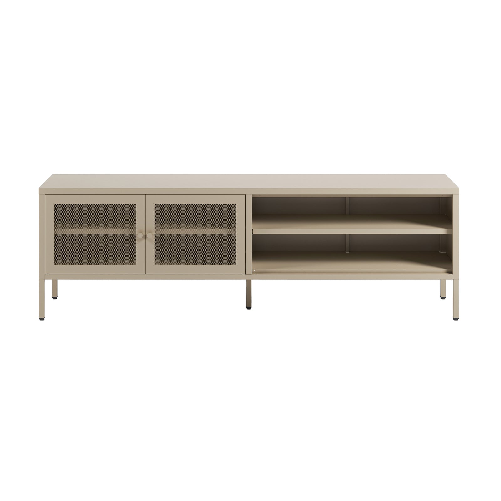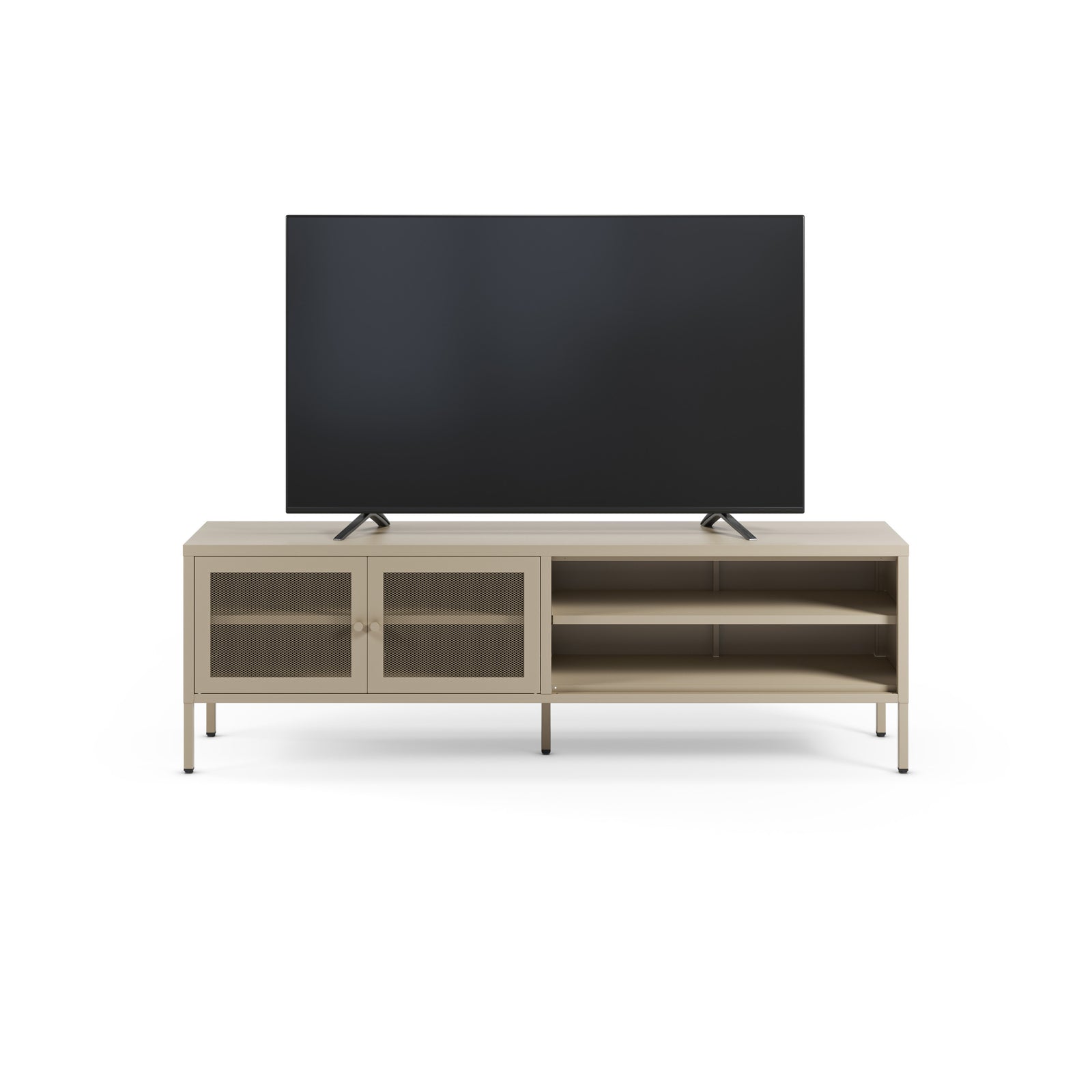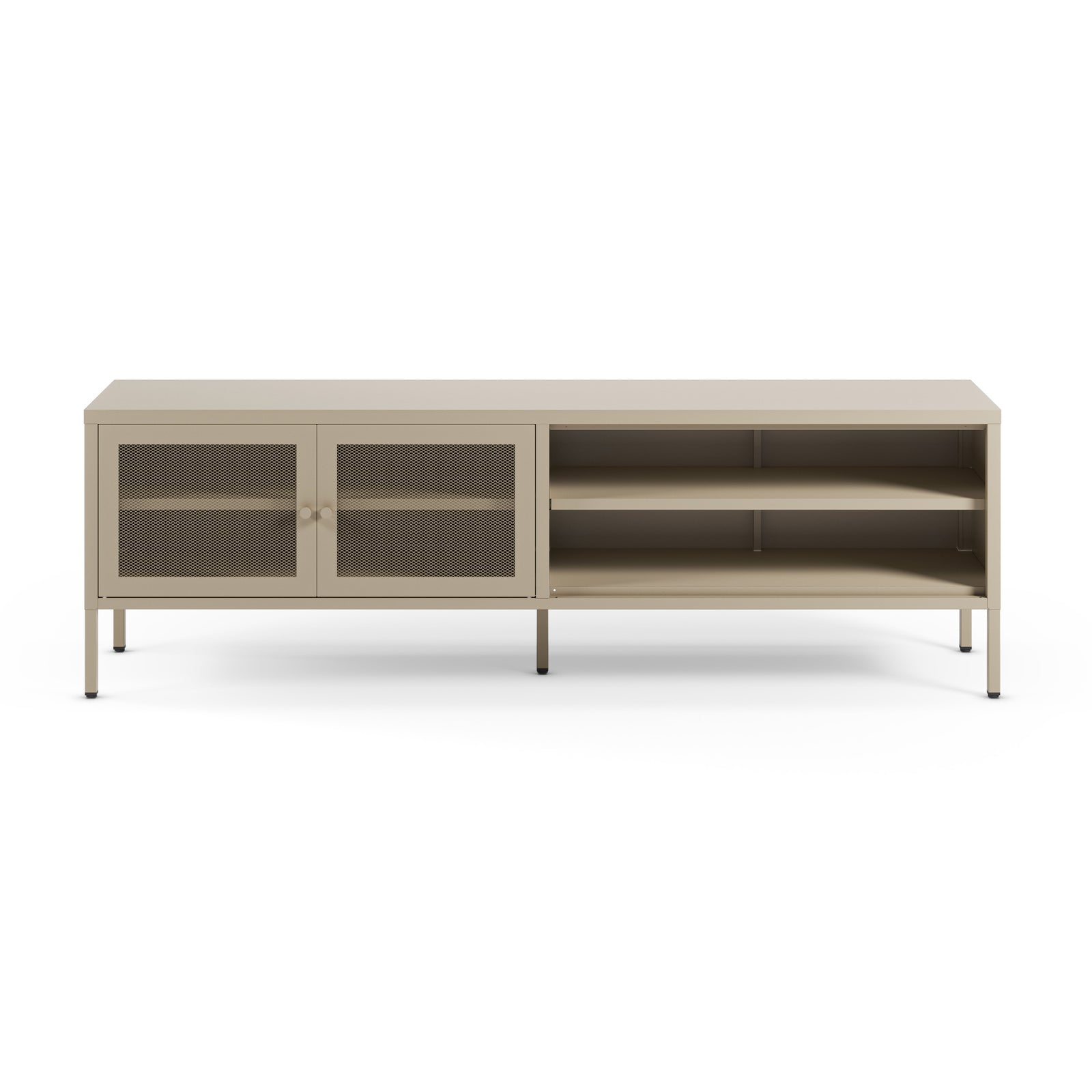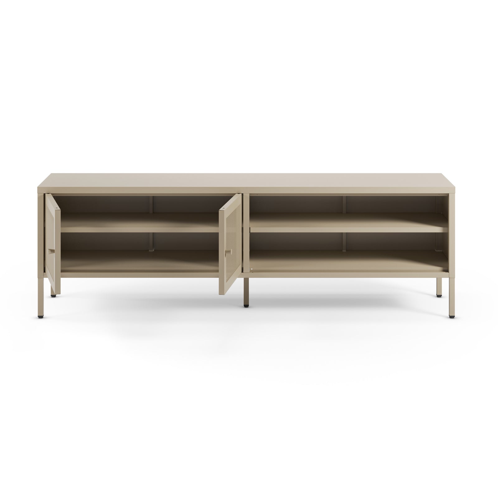 Interamente realizzato in metallo, garantisce una robustezza durevole mantenendo una silhouette leggera e ariosa. Le porte grigliate favoriscono la ventilazione degli apparecchi elettronici, portando al contempo un tocco grafico.