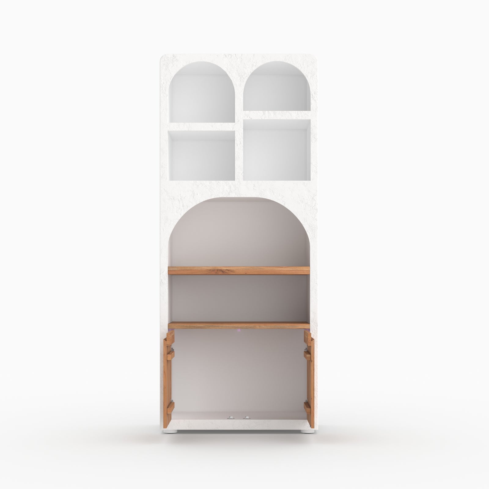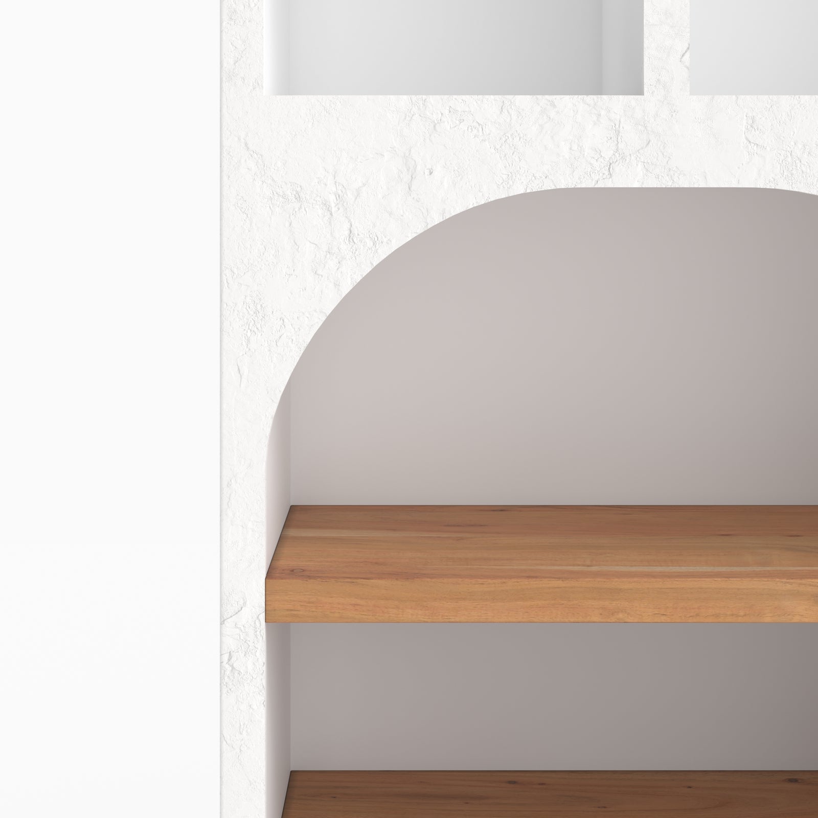 Bibliothèque en plâtre blanc cassé et bois d'acacia
