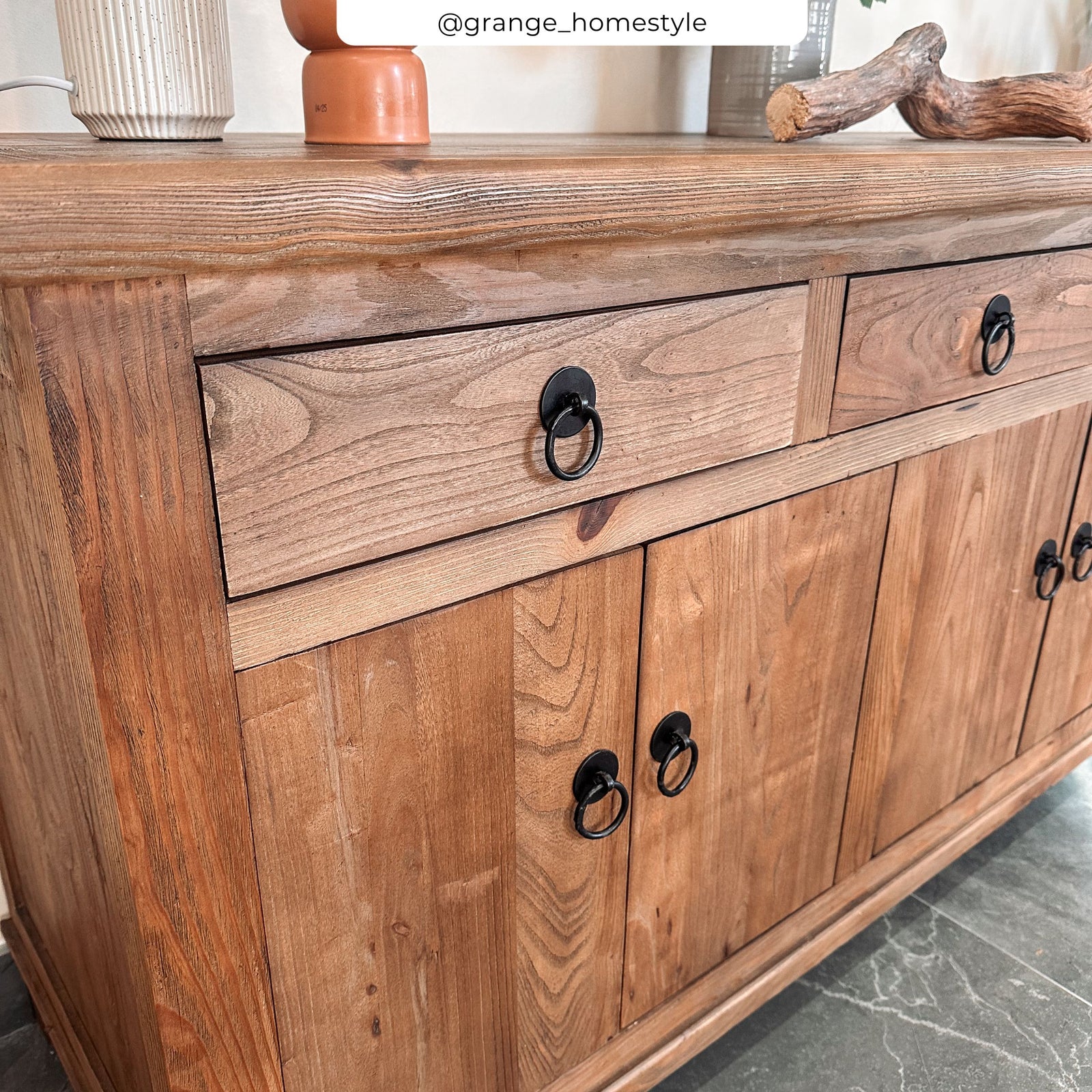 Ce grand buffet a tout pour vous séduire ! Il a été réalisé en bois d'orme recyclé, robuste et authentique, qui allie ainsi des qualités esthétiques à une grande solidité. Il se compose de 4 tiroirs et de 3 étagères pour pouvoir stocker tous vos objets, votre vaisselle, vos vêtements et autres objets de déco.