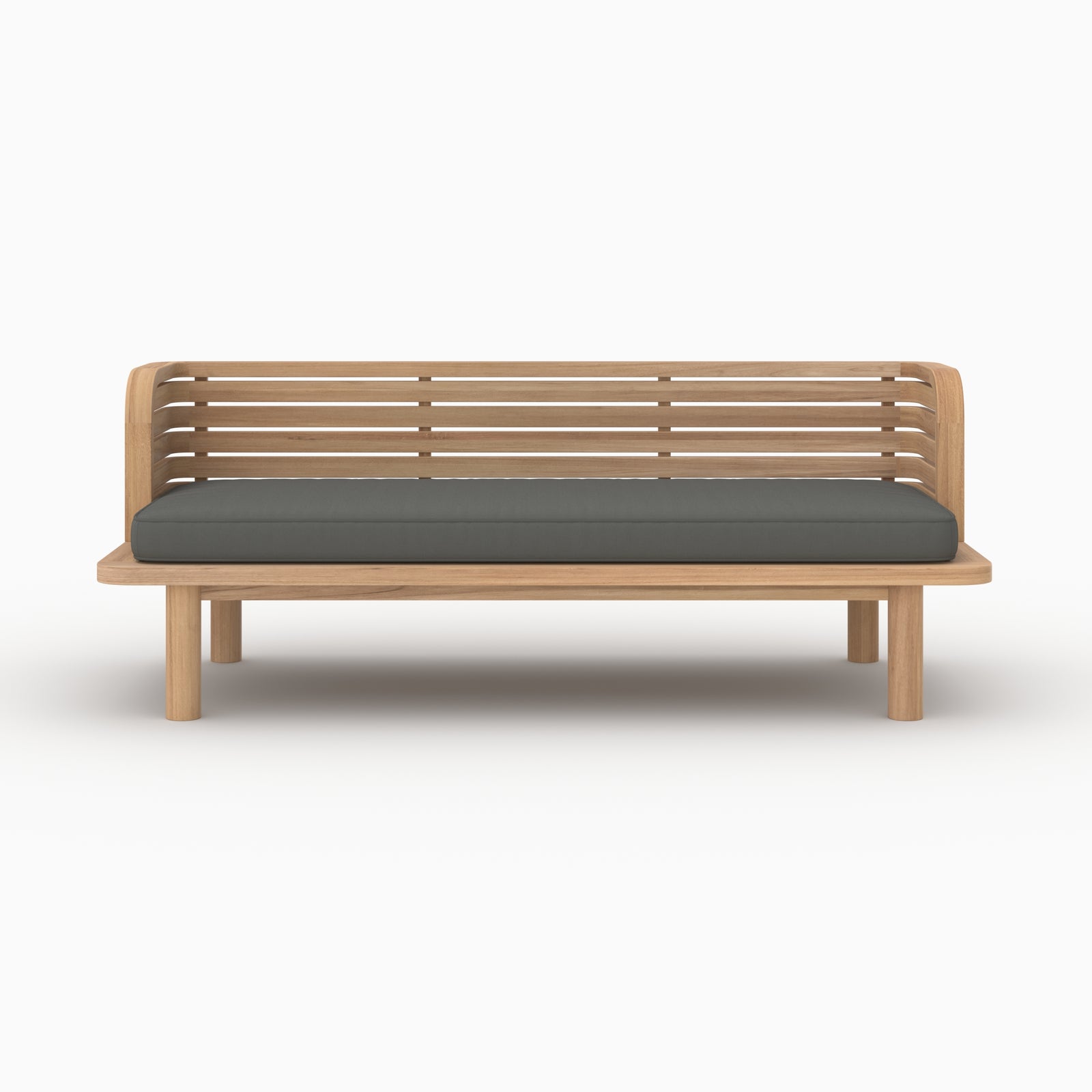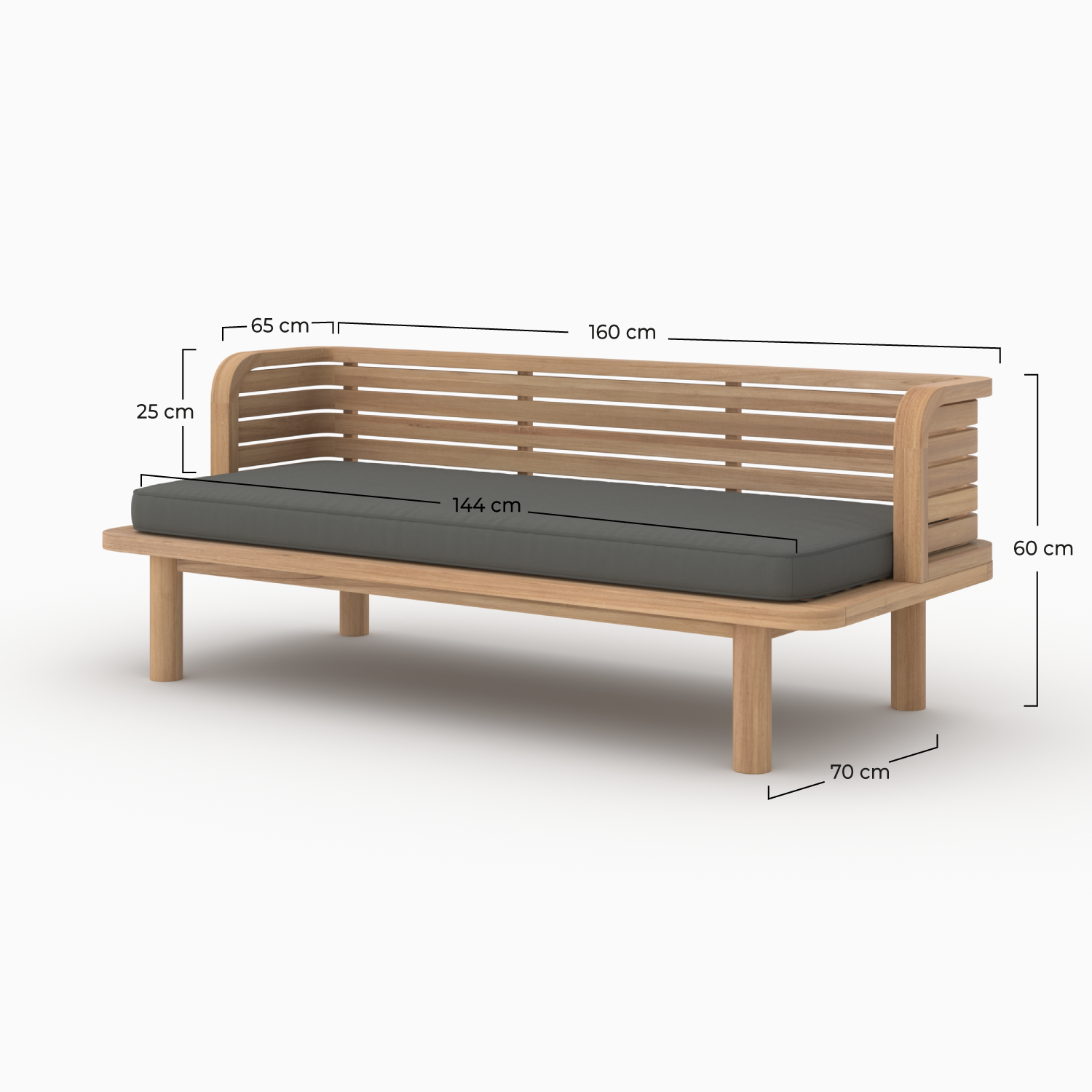 Son teck massif diffuse une chaleur naturelle, tandis que le coussin gris anthracite apporte un contraste chic et apaisant.