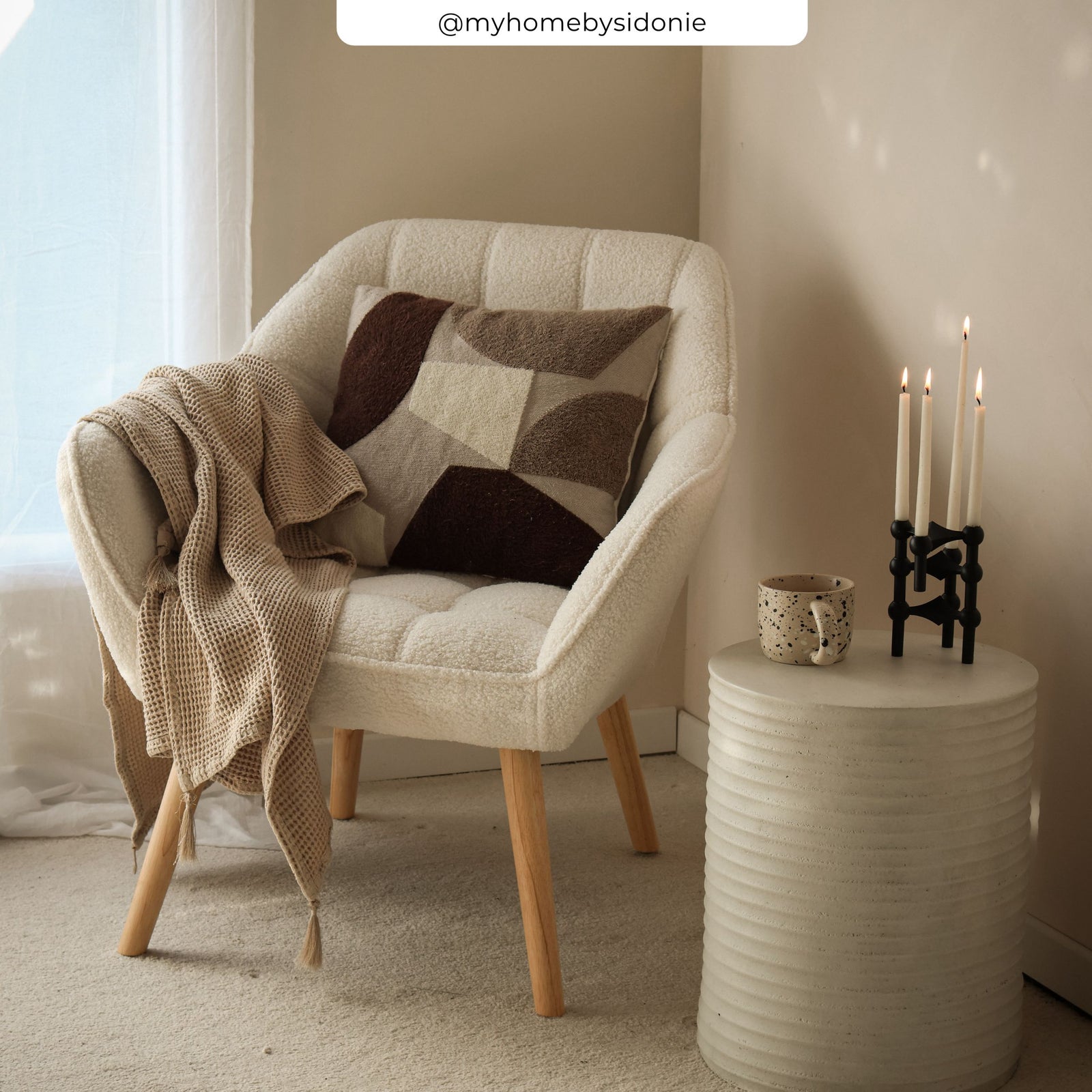 Sa texture bouclée apporte une touche contemporaine et chaleureuse, parfaite pour créer une ambiance lumineuse et accueillante. Le design enveloppant et les accoudoirs généreux du Simba en font le choix idéal pour les moments de repos absolu.