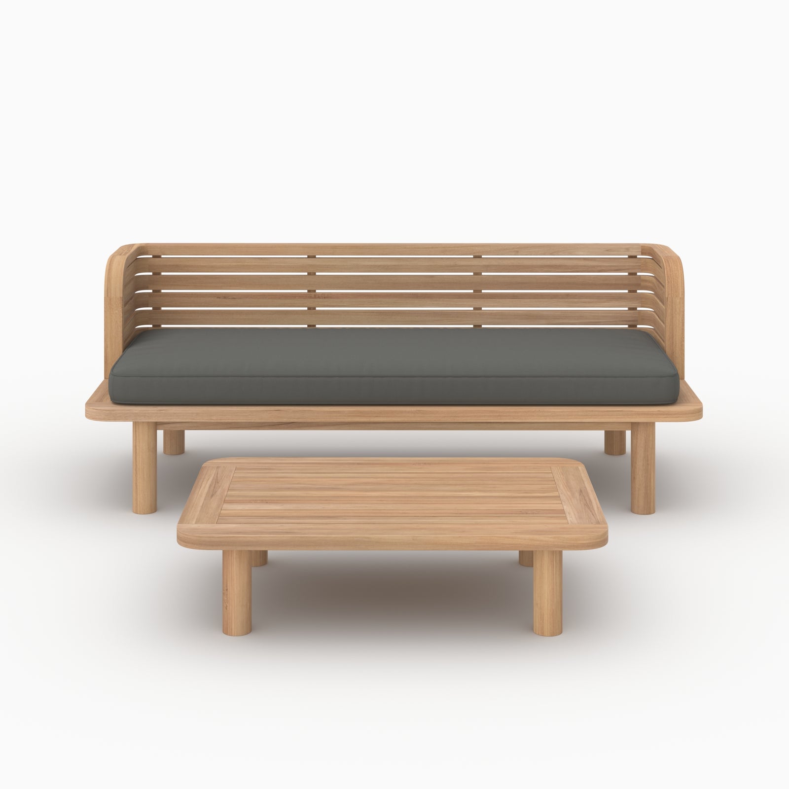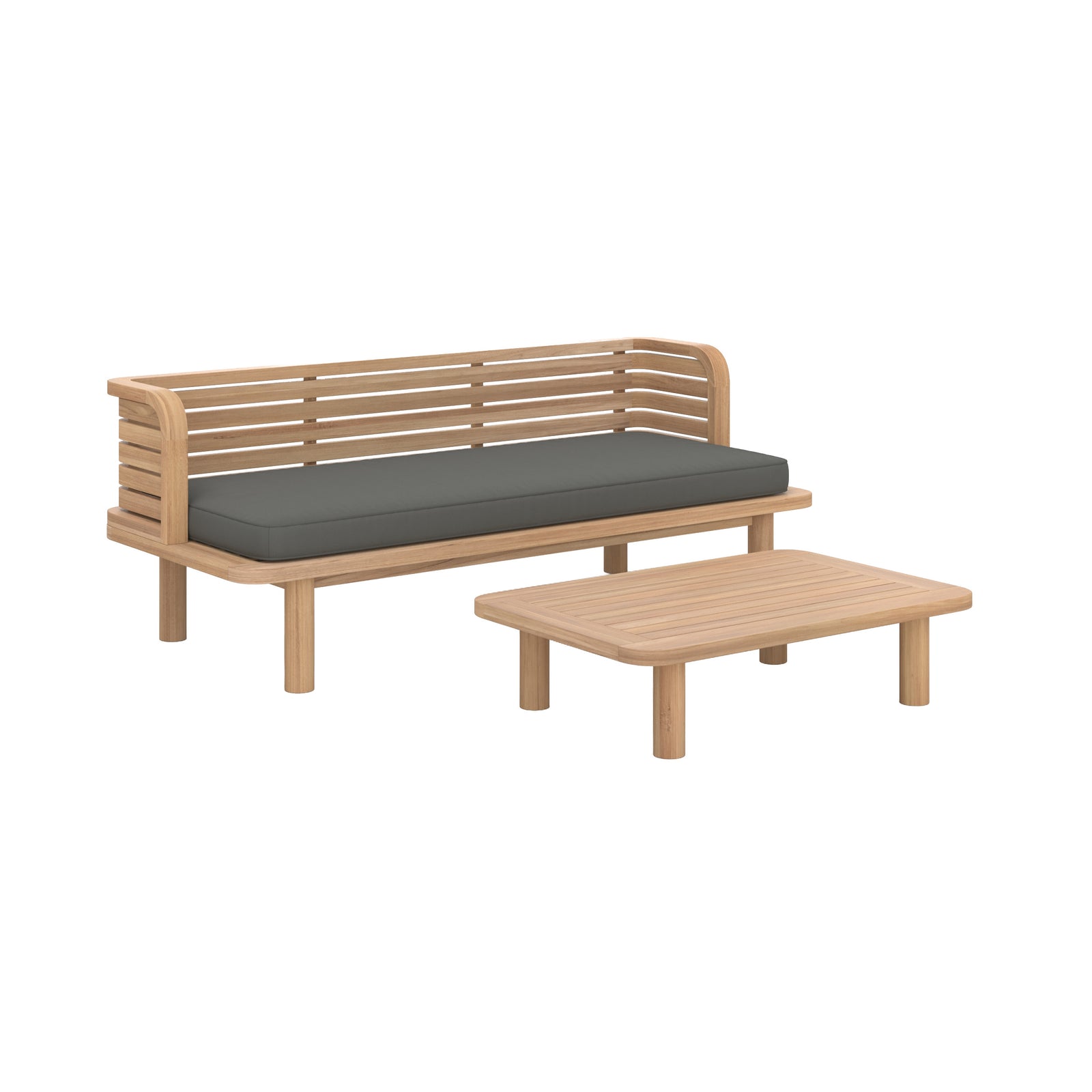 Sa structure en teck massif assure solidité et résistance aux usages extérieurs. Les coussins en tissu gris, doux et durables, offrent un confort appréciable pour profiter pleinement des moments en plein air.