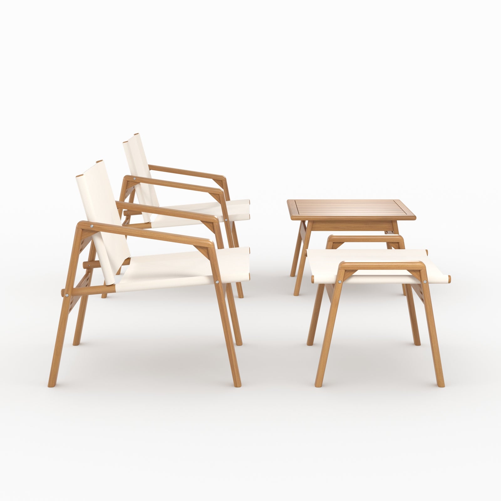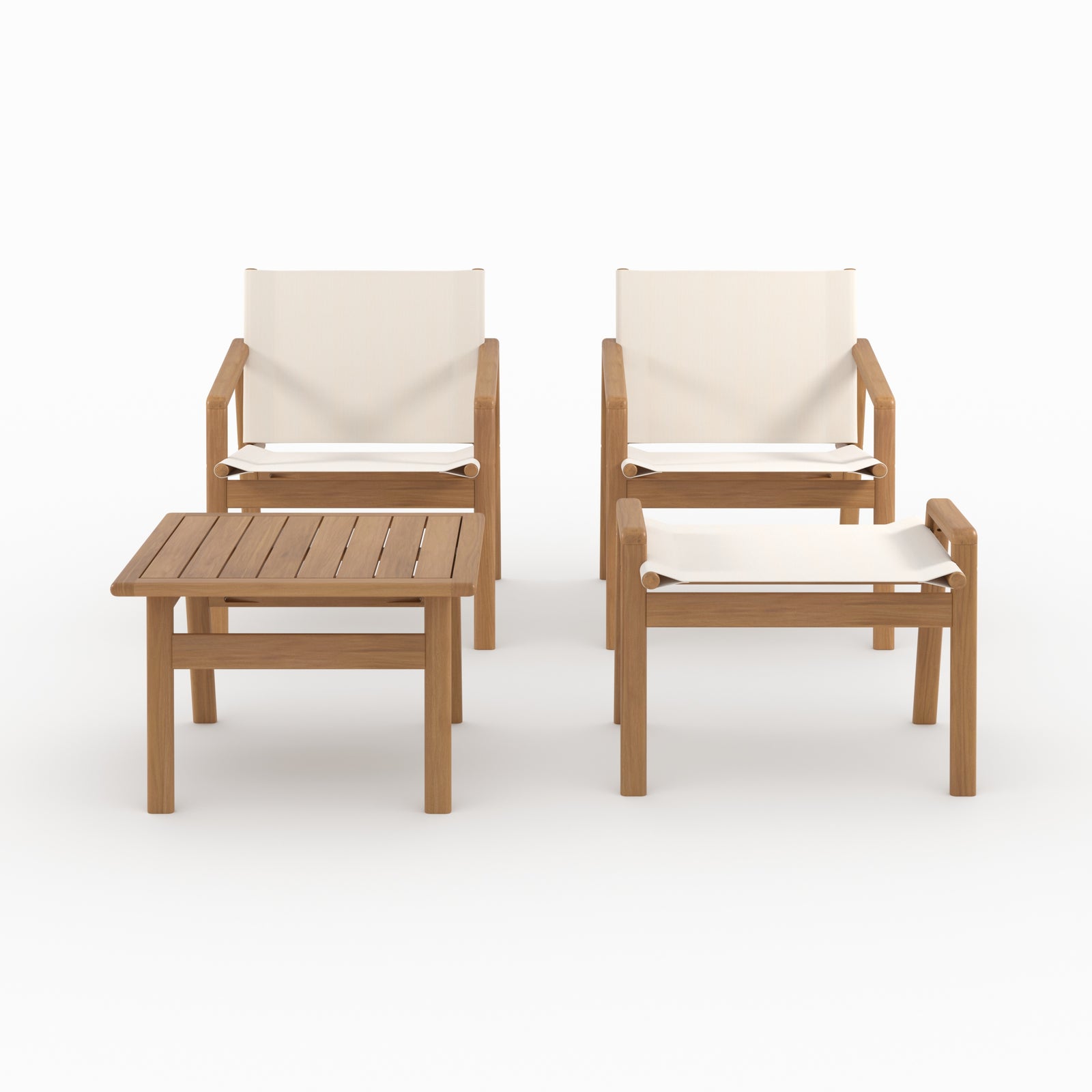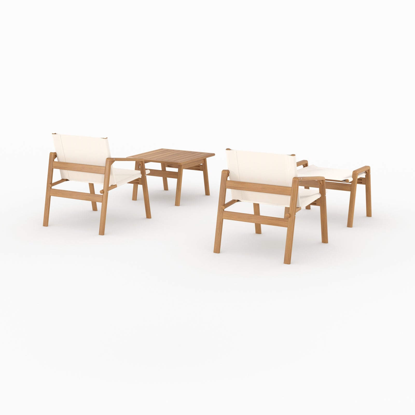 En bois d’acacia huilé, le salon Palawan séduit par la noblesse de sa matière et la chaleur de ses lignes. Ses deux fauteuils rembourrés aux accoudoirs enveloppants promettent un confort absolu, accompagnés d’un repose-pied et d’une table basse carrée pour des instants tout en douceur.