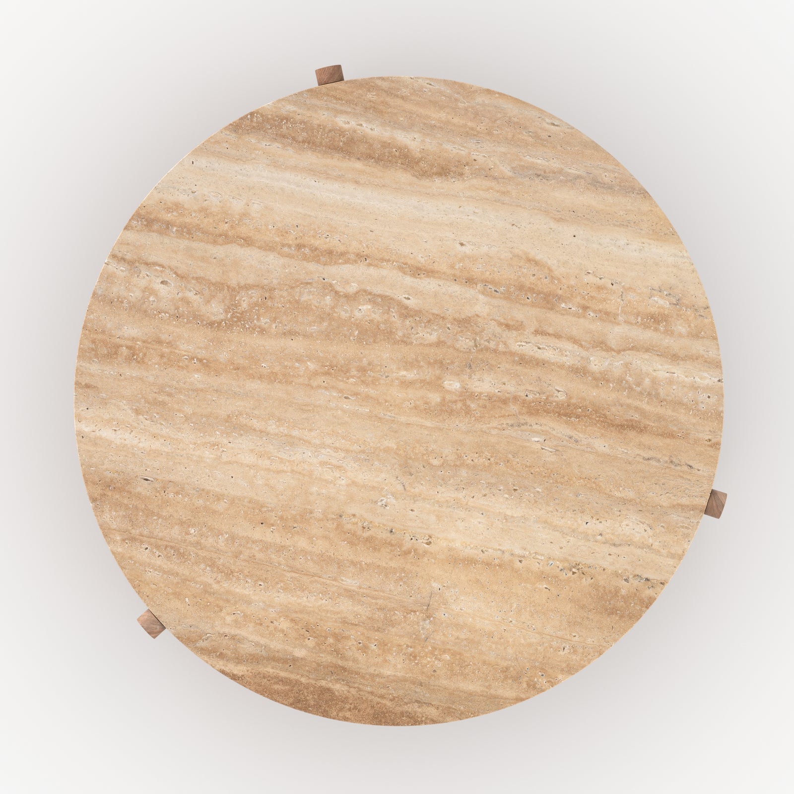 Le plateau en travertin contraste avec la structure en acacia massif, offrant robustesse, caractère et un charme brut incomparable.